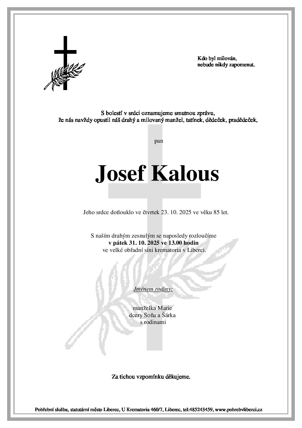 Ke své pomyslné poslední rozjížďce nastoupí Pepa Kalous v pátek 31.10.2025 ve 13 hodin. Startovní páska a duše našeho kamaráda, pro rodinu manžela, tatínka, dědečka a pradědečka, vyletí k nebi vstříc ve velké obřadní síni libereckého krematoria.